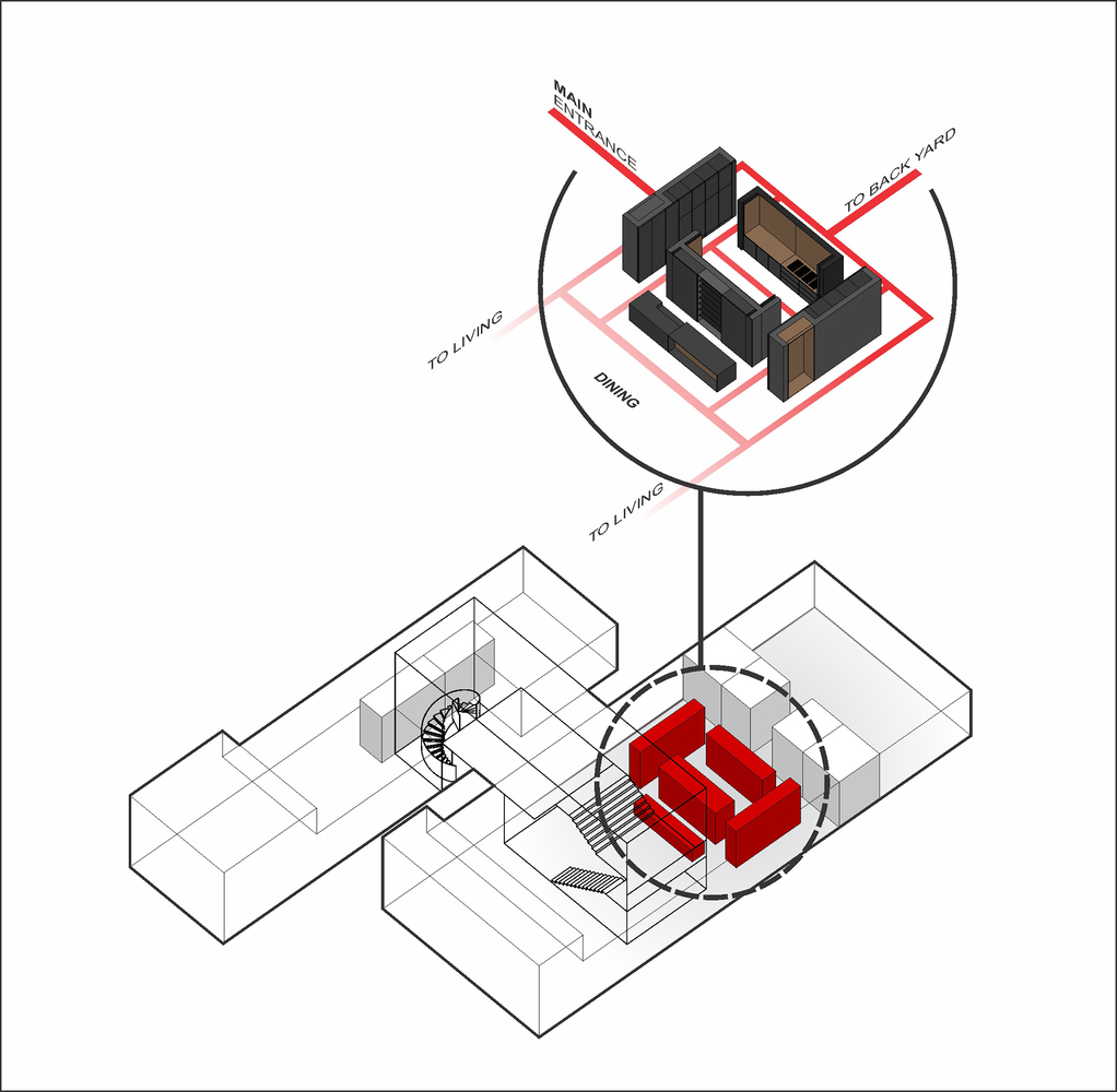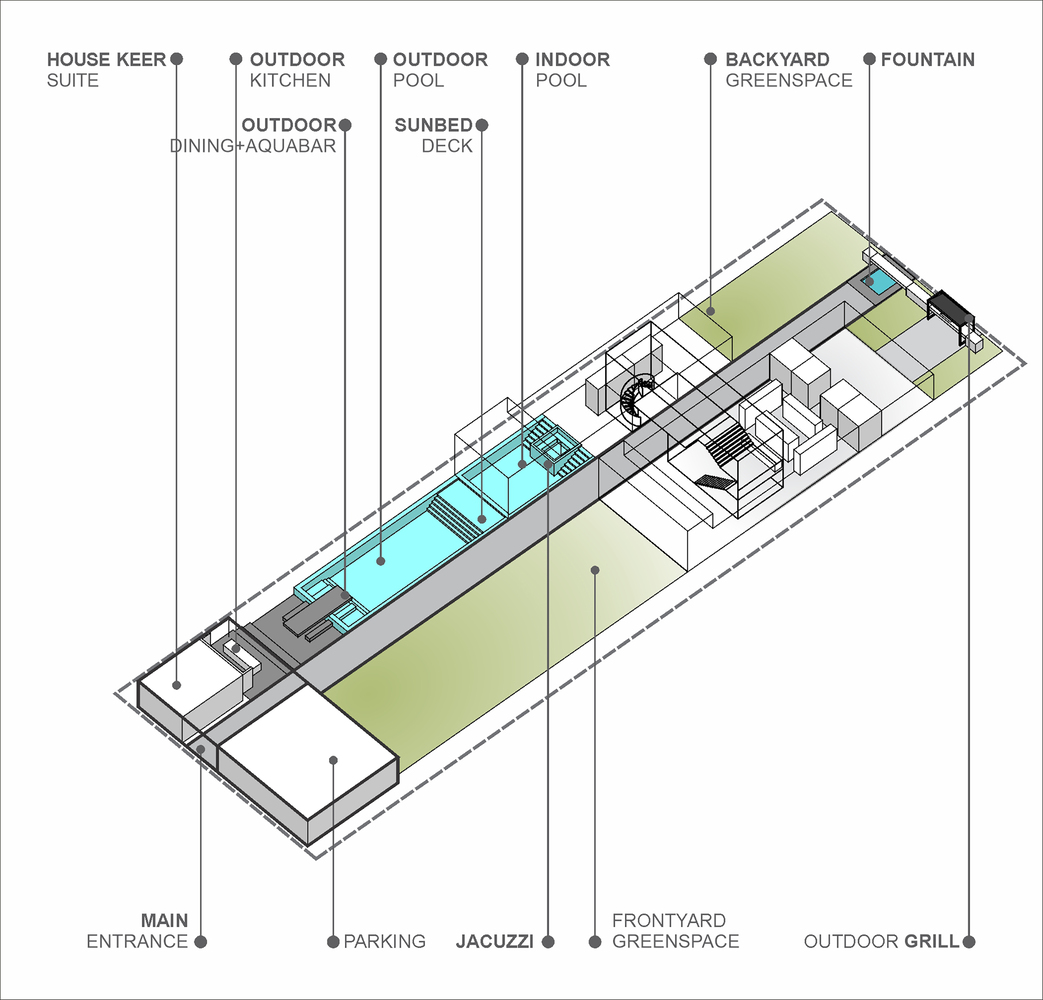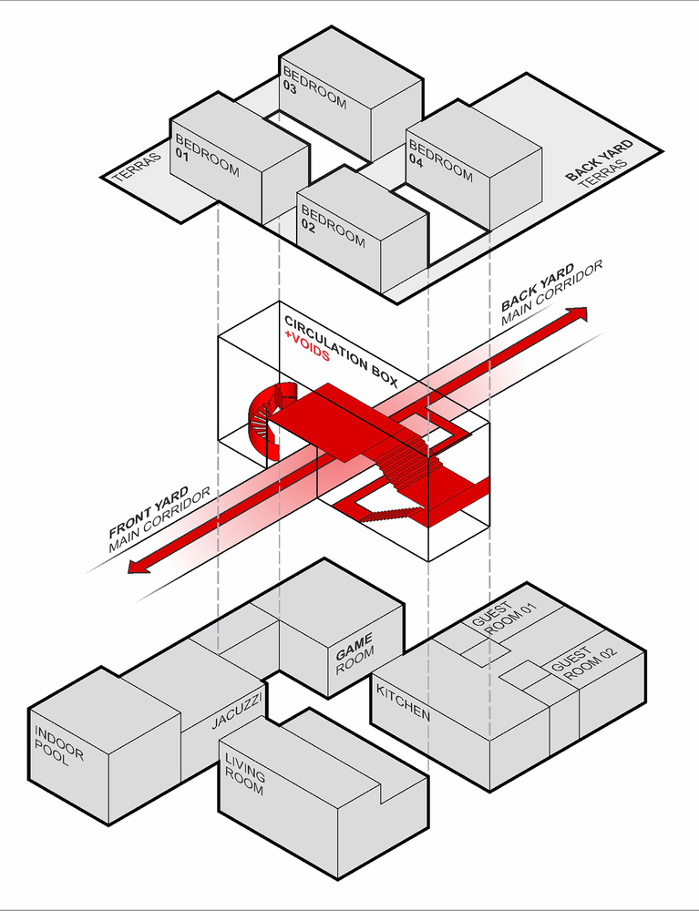 به محض ورود به ویلا، ساختمان هایی به شکل دیوارهای گابیونی وجود دارد. این ساختمان ها ورودی، ویلای سرایداری، آشپزخانه روباز و پارکینگ سرپوشیده را در ترکیب با دیوارهای سایت تشکیل می دهند. هماهنگی بین مواد و ساخت و ساز در این بخش از طراحی حیاتی است. برنامه فیزیکی پروژه شامل سالن، غذاخوری و آشپزخانه به اضافه اتاق مهمان در احجام شرقی توده و فضاهای ورزشی و بازی در احجام غربی توده است. در مجموع چهار اتاق خواب در بالای توده های زیرین و در طبقه دوم با جهت شرق به غرب واقع شده است. با دو اتصال عمودی به ولوم های پایینی متصل می شوند.