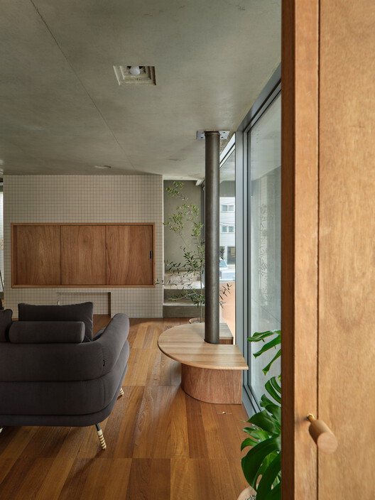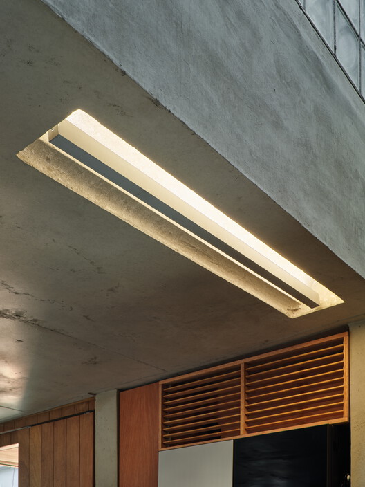 نورگیرهای کوچک، اتاق نشیمن، آشپزخانه و اتاق خوابها را به هم متصل میکنند و مسیری پیوسته از نور ایجاد میکنند. من مسیرهای نور را به عنوان نوعی مجرای خدماتی، شبیه به لولهکشی، تصور کردم، اما برخلاف فضاهای خدماتی معمولی، مردم در آنها ساکن هستند. به همین دلیل است که فضای داخلی هیچ مصالح تکمیلی اضافی ندارد. من متوجه شدم که رنگ خاکستری طبیعی بتن، مادهای ایدهآل برای نگه داشتن و پخش کردن نور خورشید است.