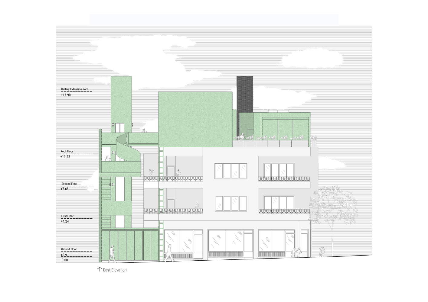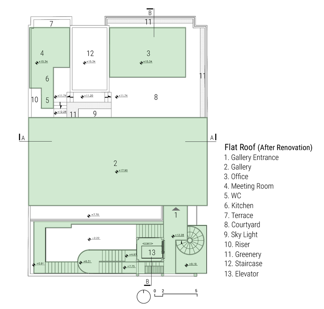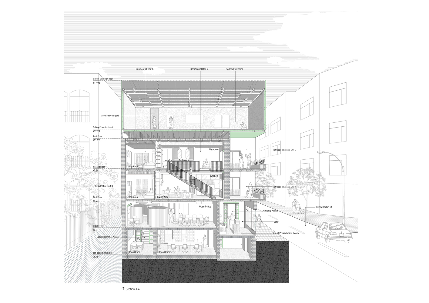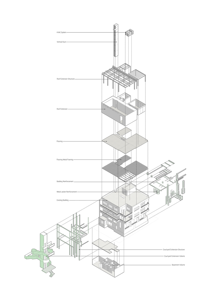 با نصب سازه الحاقی فلزی ساخته شده در حیاط، کف خاکبرداری شد و فونداسیون و سازه نگهبان اجرا شد. دیوارهای بتنی در اطراف گودال اسکلت فلزی ساخته شد و سازه پلکانی به هم متصل شده است. در سطح سقف، این سازه به ساختمان متصل شده و با سازه فلزی روی پشت بام یکپارچه شده است. مطابق با هویت تاریخی و فرهنگی محله و بناهای اطراف و همچنین ایجاد گره شهری، فضای گالری الحاقی به صورت حجمی در پشت بام این بنا طراحی شده است. به منظور ایجاد یک تجربه منحصر به فرد در حین رسیدن به حجم پشت بام و حفظ راه پله اصلی موجود فقط برای دسترسی مسکونی، یک مسیر عمودی به عنوان امتداد به حیاط اضافه شده که از طریق پل ها و راه پله ها به گالری پشت بام منتهی می شود.