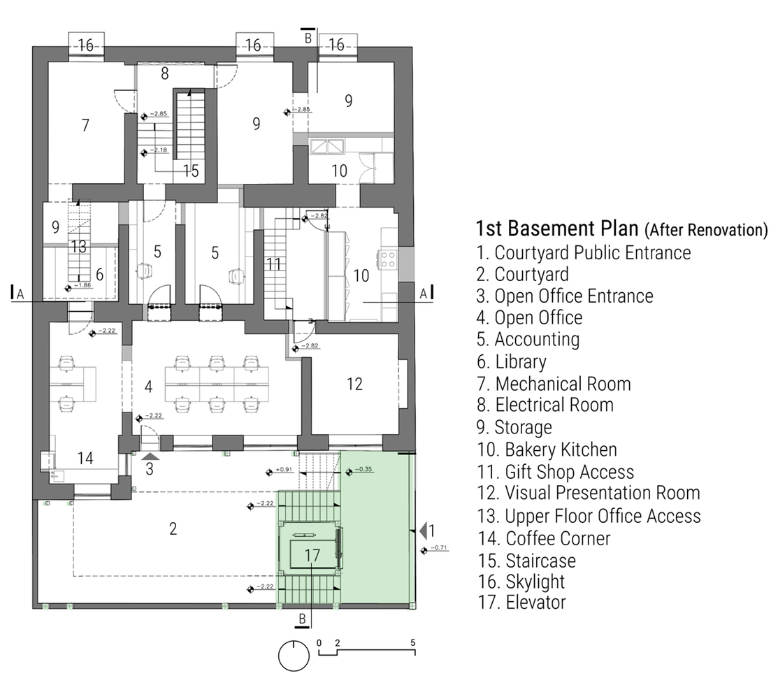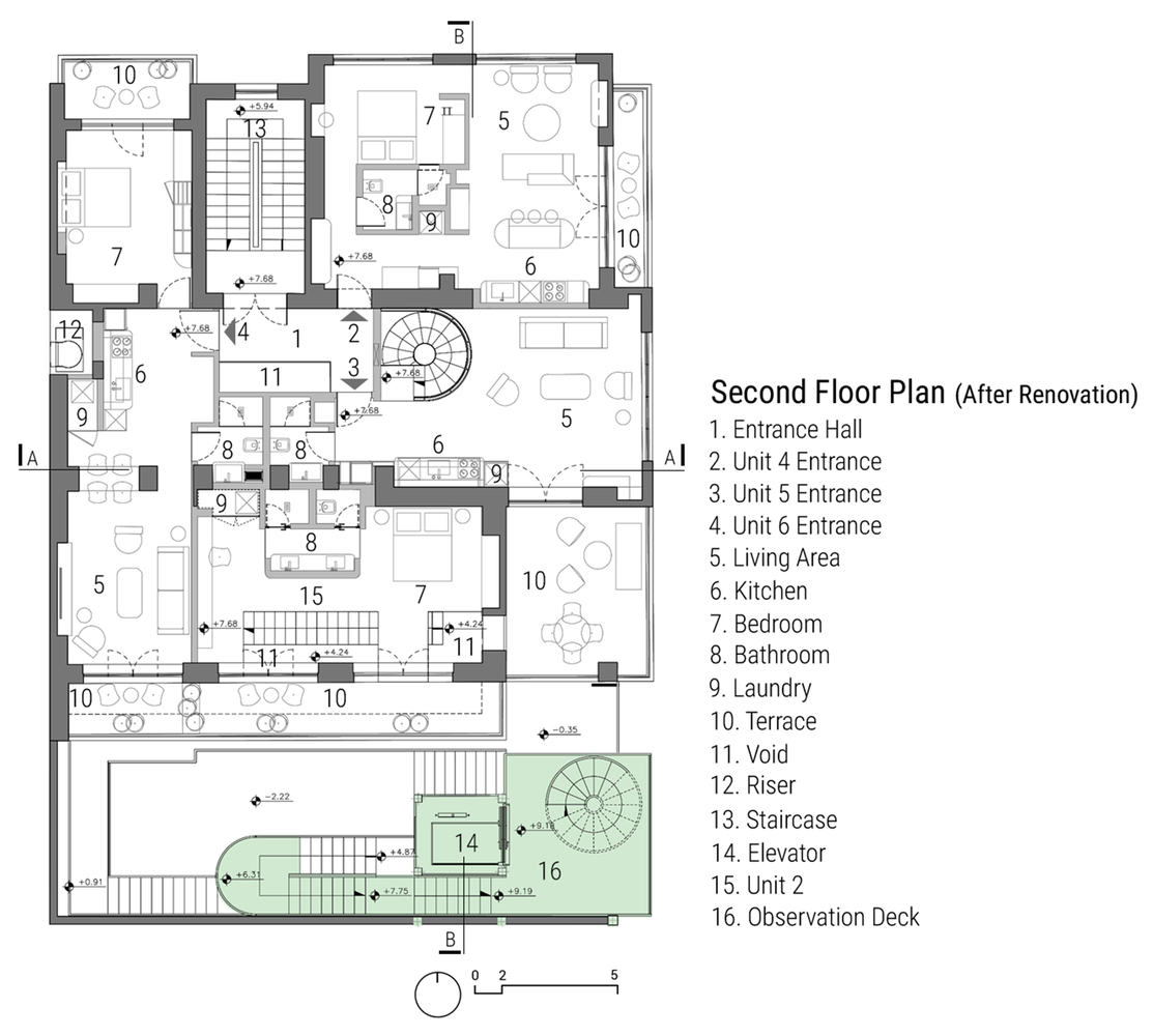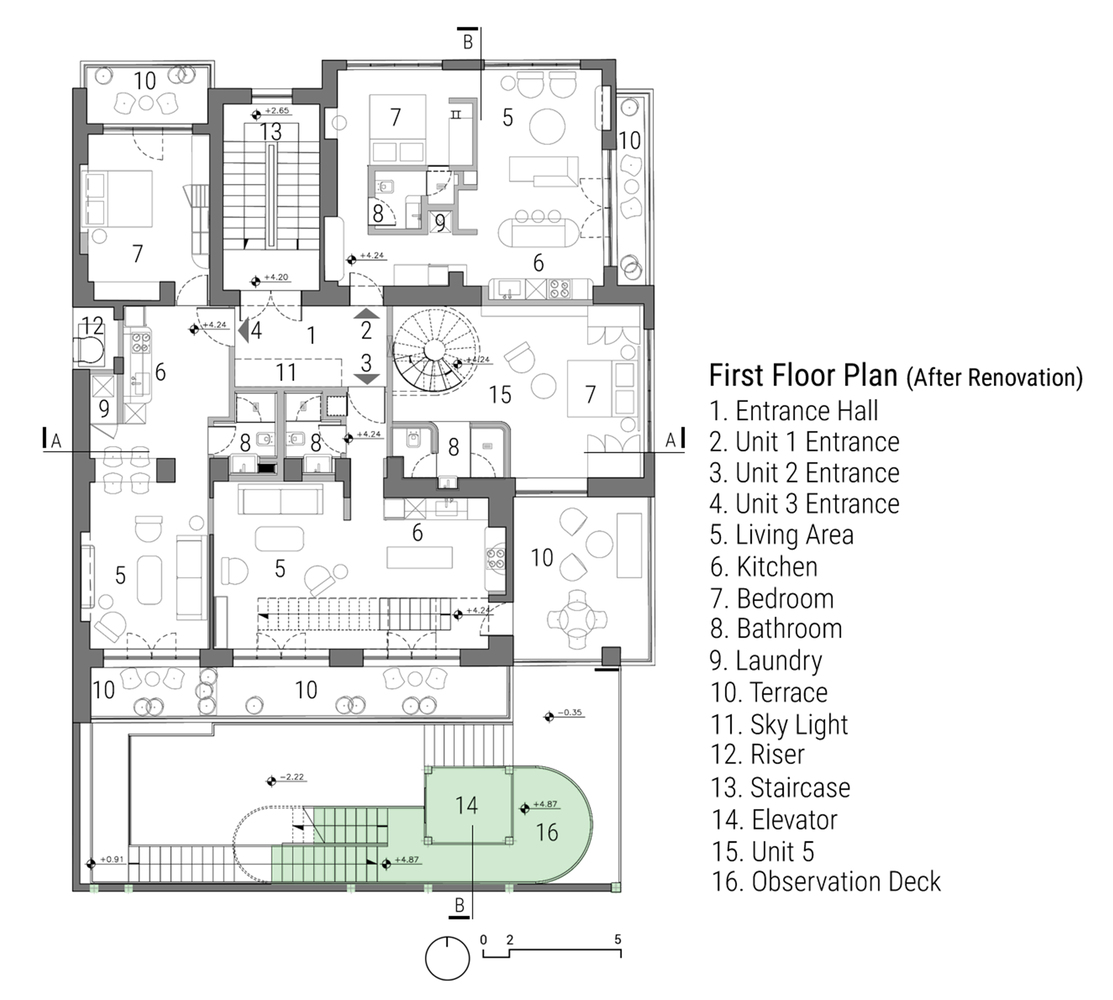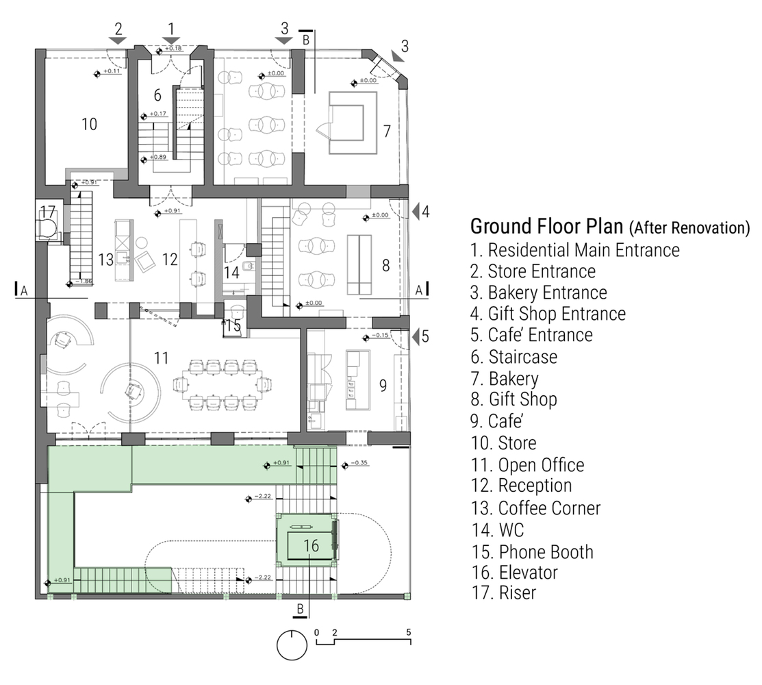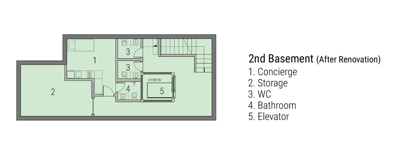 با هدف حمایت از احیای بافت مرکزی شهر تهران و توسعه پروژه بلند مدت احیای بافت های شهری، برنامه های جدیدی اجرا و الحاقاتی به بنا اضافه شد. پس از مقاوم سازی ساختمان با افزودن مهاربندی های فلزی و جلیقه های فولادی بر روی ستون های موجود، سقف های طاق دار توسط تیرهای فلزی نگه داشته شد و بین طبقات بازشو ایجاد شد. دو واحد مسکونی به شش واحد کوچکتر تبدیل شده و یک فضای اداری نیز به برنامه اضافه شده است. خرده فروشی ها به کافه، شیرینی فروشی و فروشگاه های هدیه تبدیل شدند. دعوت از بازدیدکنندگان به مجتمع و برجسته کردن تأثیر قابل توجه آنها بر هویت پروژه از طریق ارتباط روزانه با ساکنان محله.